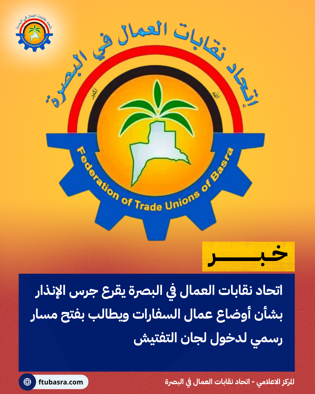 اتحاد نقابات العمال في البصرة يقرع جرس الإنذار بشأن أوضاع عمال السفارات ويطالب بفتح مسار رسمي لدخول لجان التفتيش