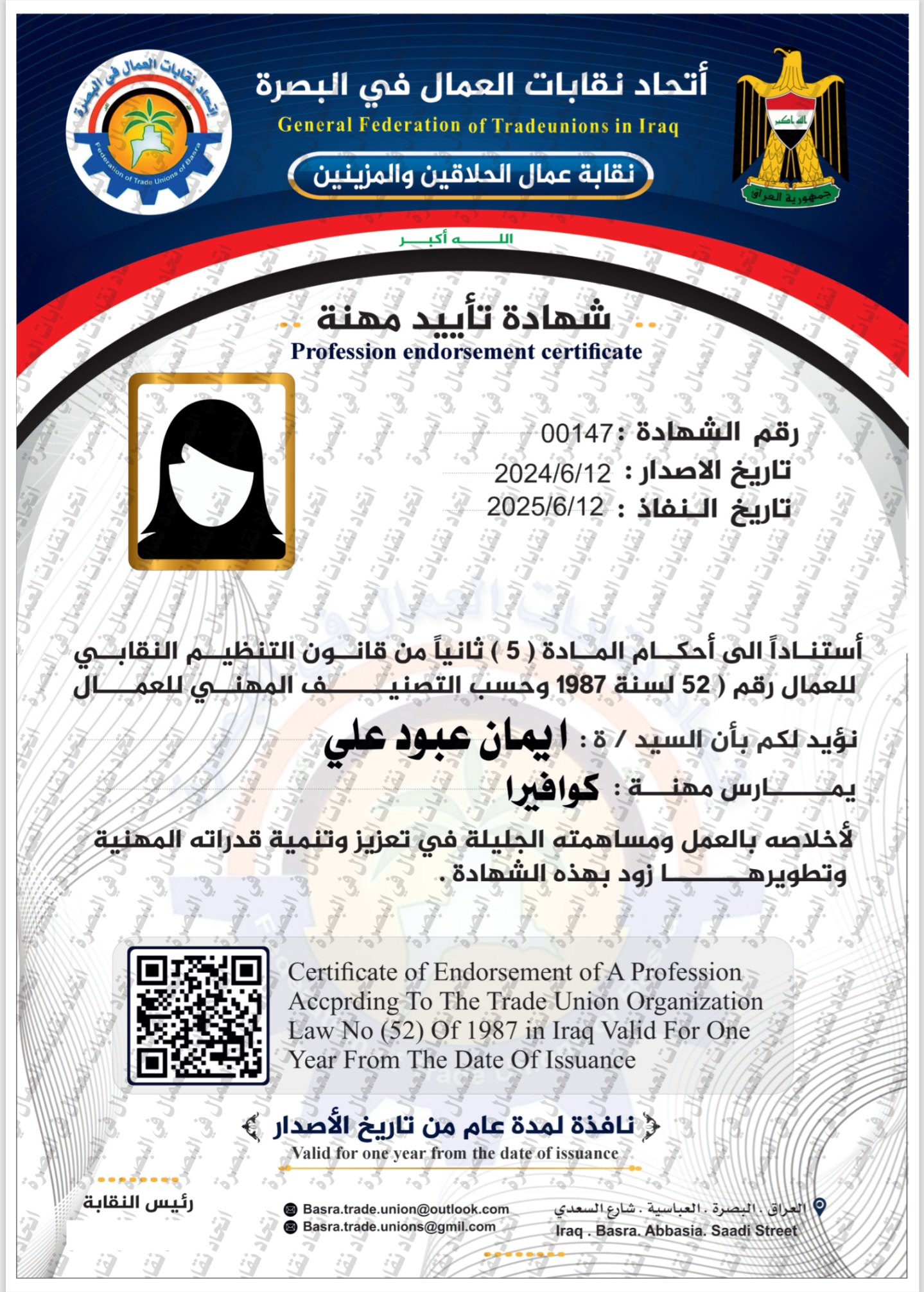 مراجعة مقر اتحاد نقابات العمال في البصرة – شارع السعدي – مجاور اتحاد رجال الأعمال العراقيين في البصرة.